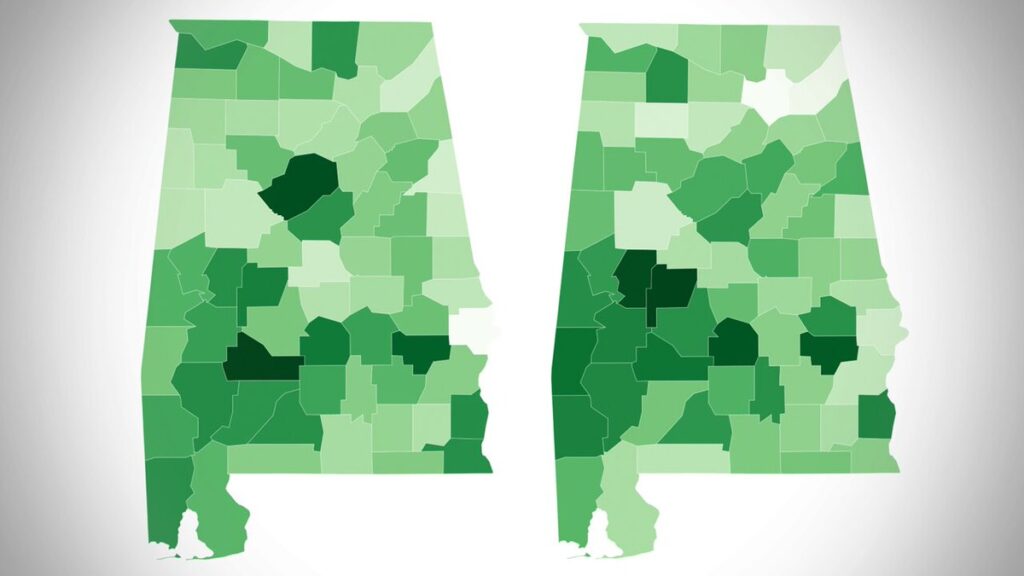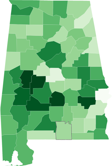Percent of total population and by race receiving at least one COVID-19 vaccine in each Alabama county.