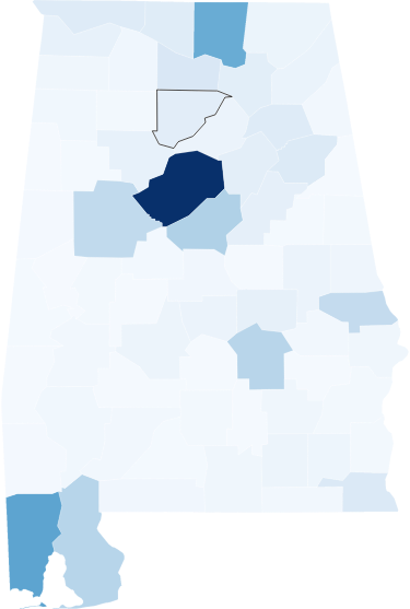 Marshall County, in northeast Alabama, is home to just under 2,300 Black people 16 years old or older, according to state data. Just 159 of those, or 7 percent, have gotten a vaccine. That’s the lowest percentage of Black residents getting a vaccine in any Alabama county. Only one other is below 10 percent – neighboring DeKalb County, at 8.5 percent. Less than 2 percent of the population in DeKalb is Black.