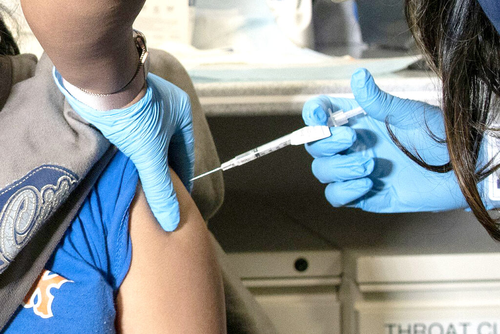 Kamila Grande, 8, receives a COVID-19 vaccination at Elmhurst’s hospital in the borough of Queens in New York, on Friday, Nov. 5, 2021. (AP Photo/Eduardo Munoz Alvarez) APAP