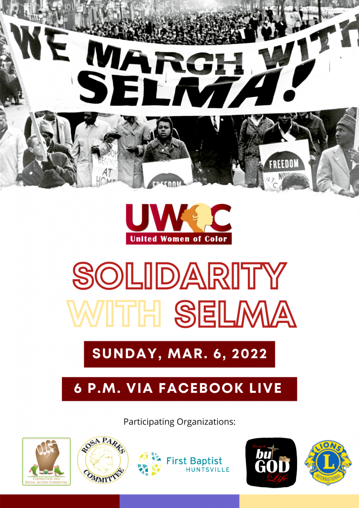 Alabama State House Minority Leader Anthony Daniels, State Representative Laura Hall, and United Women of Color in partnership with several community organizations will host a virtual bridge crossing commemoration on Sunday, March 6, 2022, at 6 PM CST. The event will stream live from the United Women of Color Facebook Page. Sheyann Webb-Christburg, named the “Smallest Freedom Fighter” by the late Dr. Martin Luther King Jr., will share her story and history with Selma and subsequent bridge crossings. Webb-Christburg will be interviewed by Madison Saylee, an honor student in the sixth grade at Grace Lutheran School and the first youth to receive the Laura Hall Humanitarian Award from the Rosa Parks Committee of Huntsville/Madison County. Our event, entitled, “Solidarity with Selma” will also include a moderated panel discussion about the Supreme Court’s decision regarding Alabama’s redistricting maps and current legislation introduced to sup- press voters’ rights. Some of the panelists include state legislator and attorney Rep. Prince Chestnut and Monica Riley of the ACLU and the Alabama Voters Rights Coalition (AVRC).