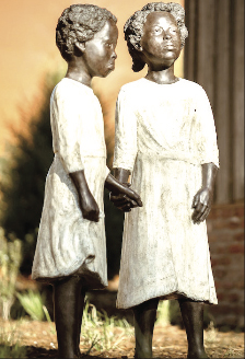 Visitors to the Freedom Monument Sculpture Park wind a serpentine path past art pieces depicting the lives of enslaved people in America and historic exhibits, including two cabins where the enslaved lived, before arriving at a towering monument.